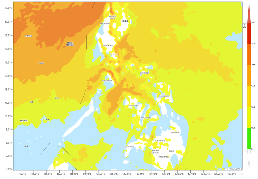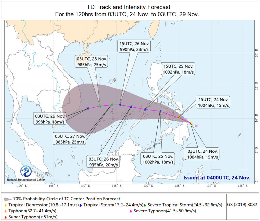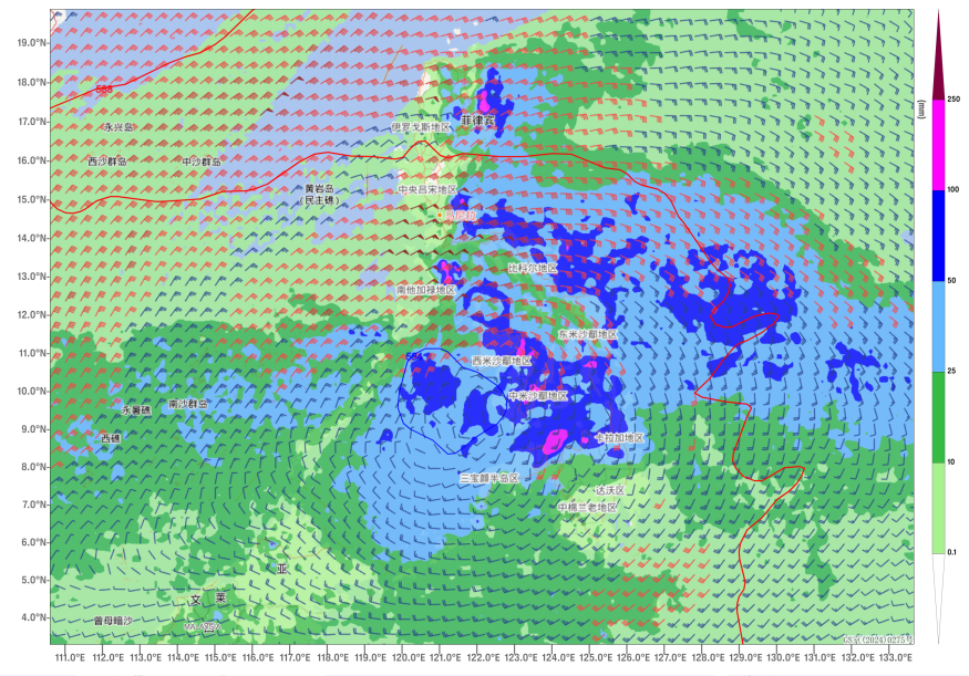 On the morning of November 24, a tropical depression was located near the eastern coast of Mindanao, the Philippines. It is expected that it will move west-northwestward through the central part of the Philippine Islands. It may intensify into Typhoon No. 27 of this year within the next 24 hours, with the maximum intensity reaching that of a strong tropical storm (Figure 1). Over the next three days, the Philippines will experience heavy to torrential rain, with localized extremely heavy downpours (Figure 2), accompanied by strong winds of 6-7 levels, with gusts reaching 8-9 levels (Figure 3). Additionally, influenced by the tropical low-pressure system, regions including the Malay Peninsula, Sumatra, Sri Lanka, and southeastern India will continue to face heavy to torrential rain, with localized extremely heavy downpours. Most areas will accumulate rainfall of 100-160 mm, with some regions reaching 200-250 mm, and the maximum could exceed 400 mm (Figure 4). Attention should be given to the adverse impacts of the severe weather on local power facilities, transportation, and other sectors, as well as the prevention of secondary disasters such as flooding, landslides, and mudslides that may be triggered by the heavy rainfall.